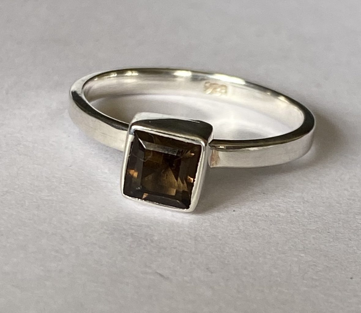Smokey quartz square cut gemstone set in a rubover setting with a very narrow 2 mm flat band. The setting is twisted very slightly off centre which looks very stylish.