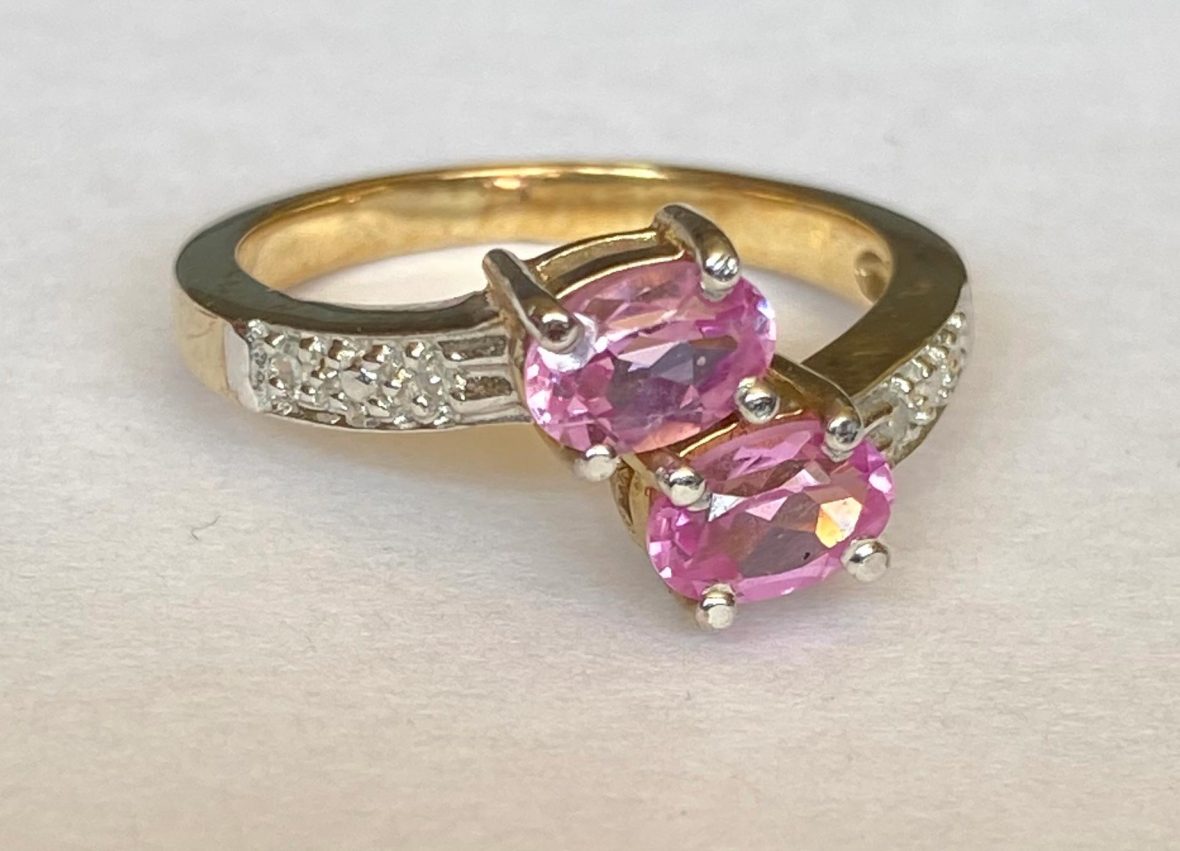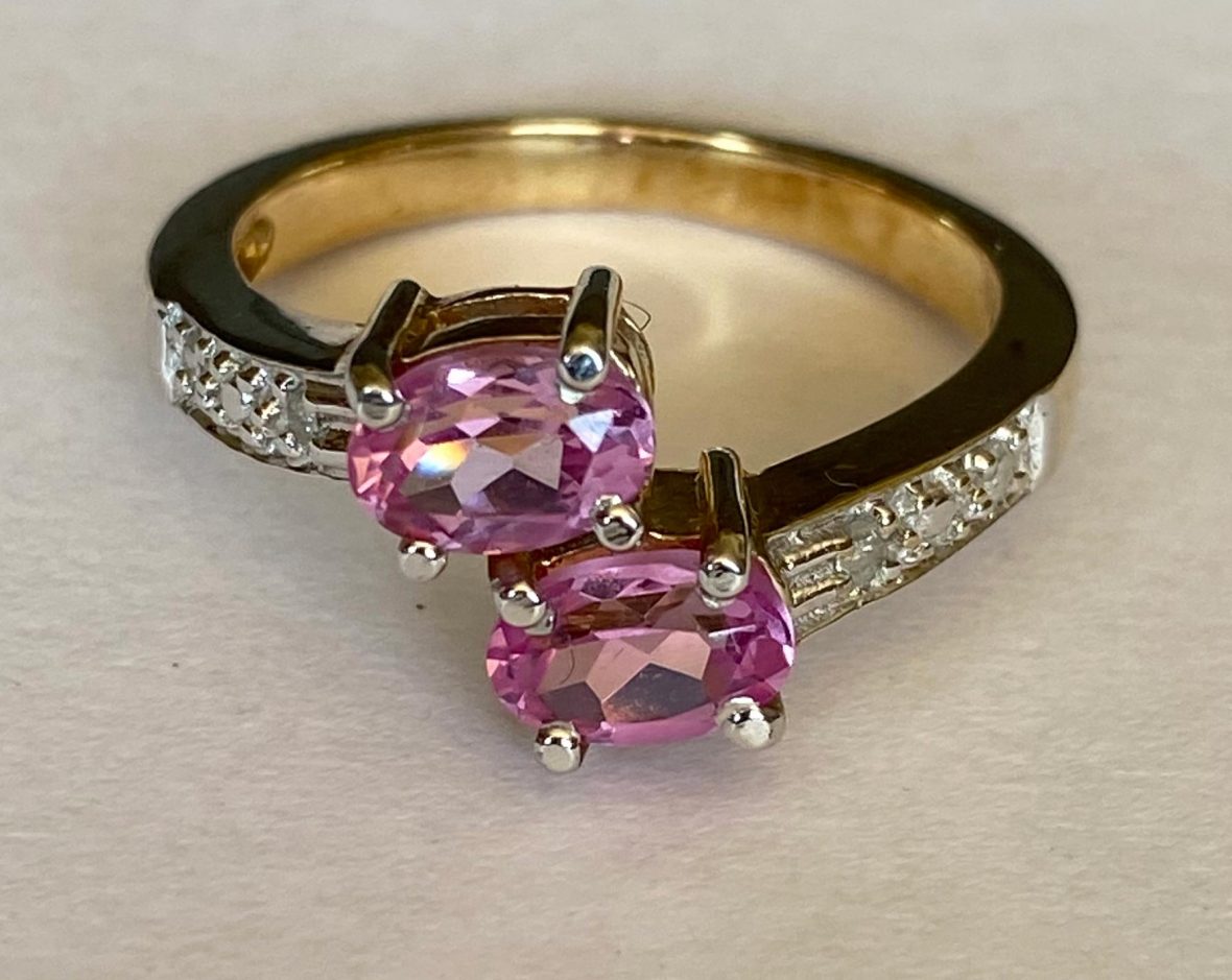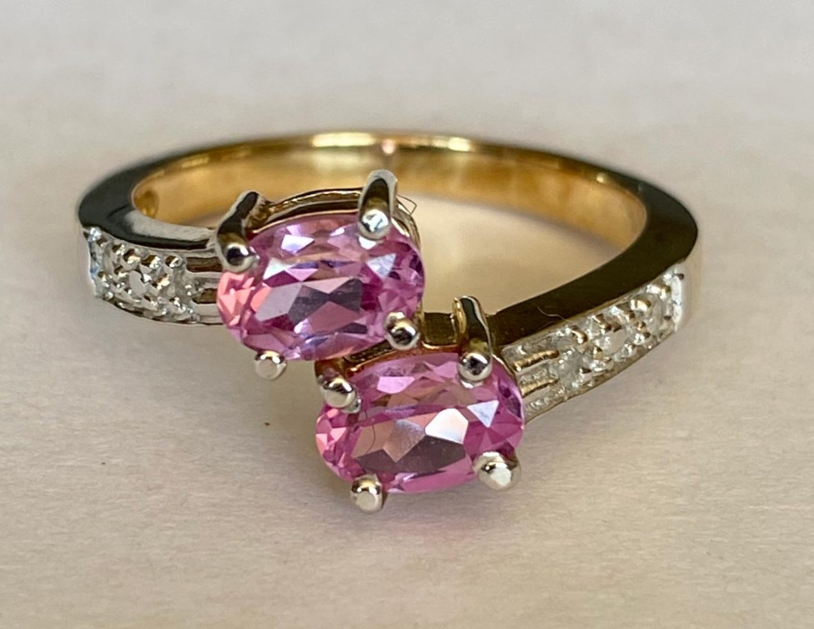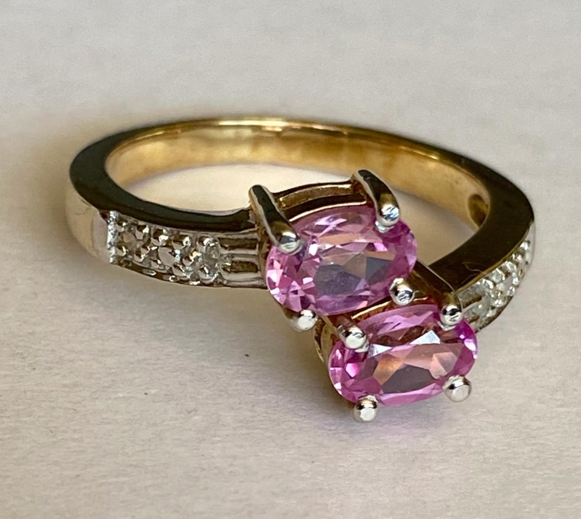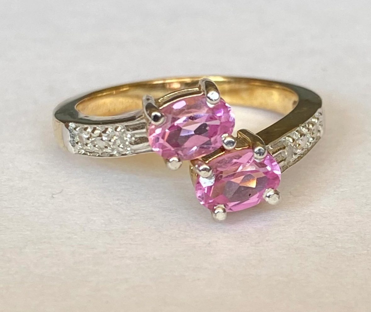 This is a stunning ring set with 2 beautiful oval tourmalines in dazzling bright pink each approx. 6 x 4mm. Set in 4 claw yellow gold settings. Each shoulder is set with 2 tiny diamonds enhanced with a white gold grain setting.
