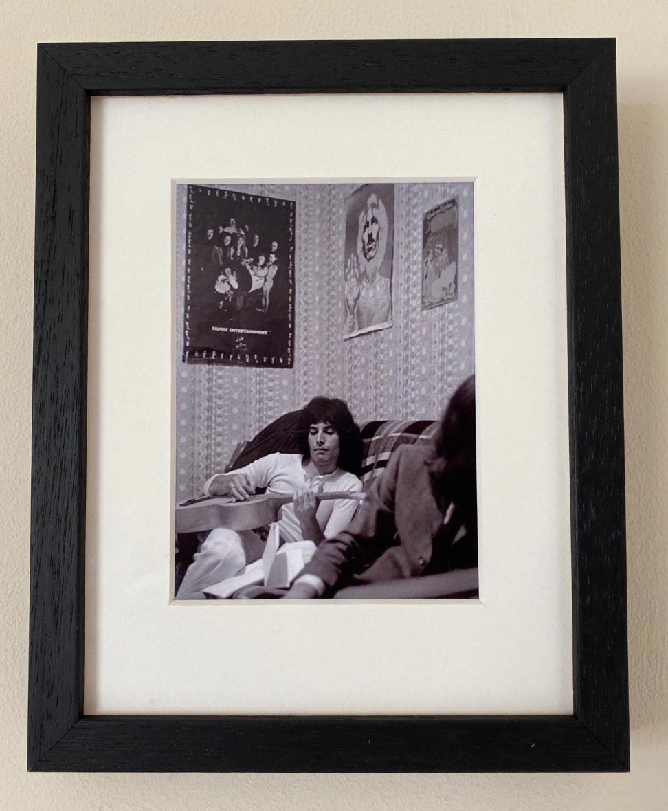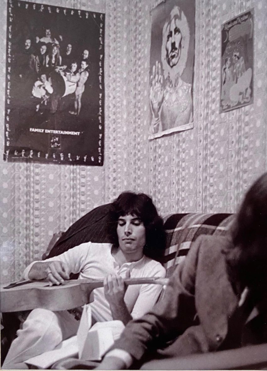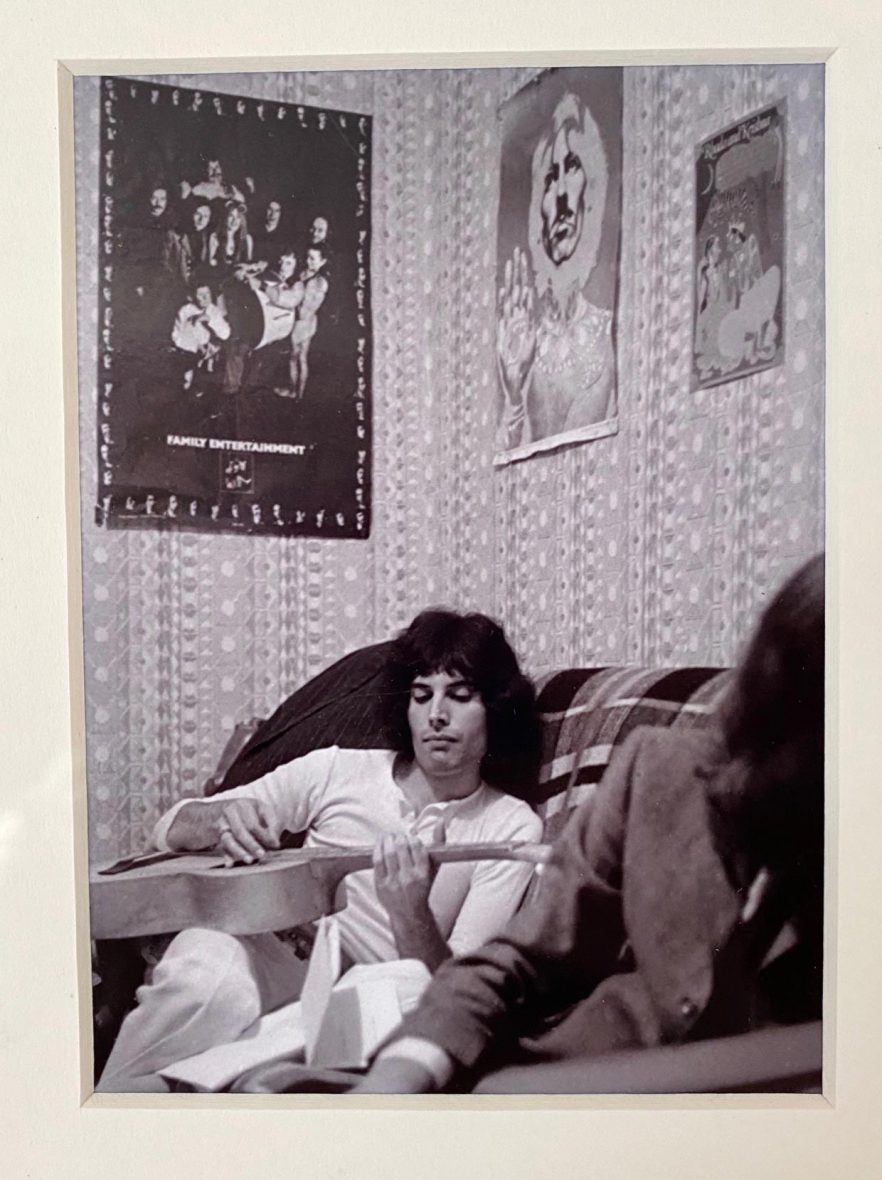 Paul Humberston’s photograph is a marvellous record of the West Kensington days. There is a practice session with Brian and Tim at Roger’s flat share in Sinclair Gardens and the earliest ever pictures of Freddie playing the guitar. “He was unsure of his ability”, remembers Chris Smith about this photograph.