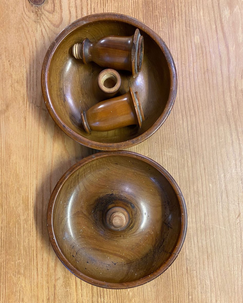Very rare, early 19th century, pair of officer’s wooden campaign travel candlesticks with screw in sconces which dismantle and fit into screw down box.