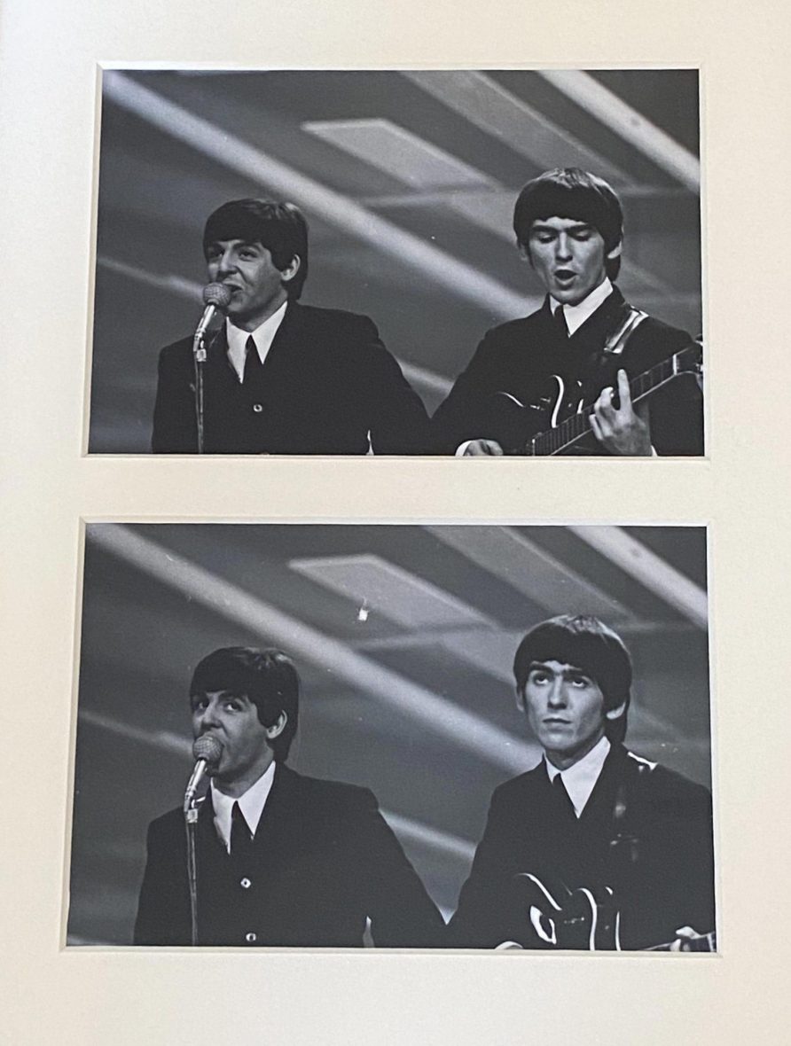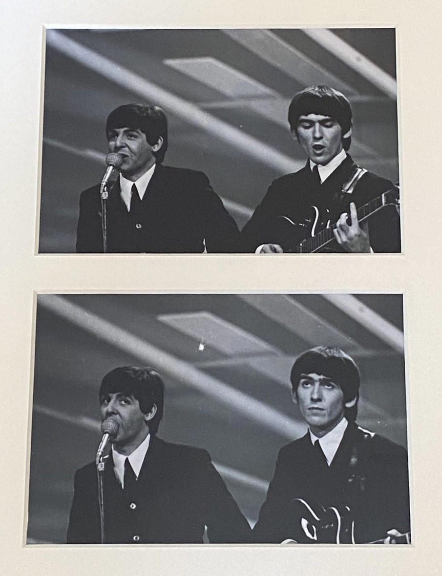 Double photographs of Paul McCartney and George Harrison performing with The Beatles on the Ed Sullivan Show.