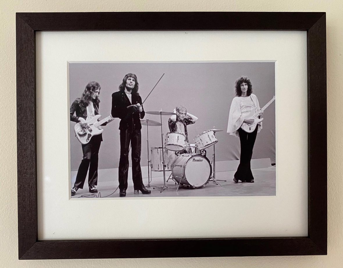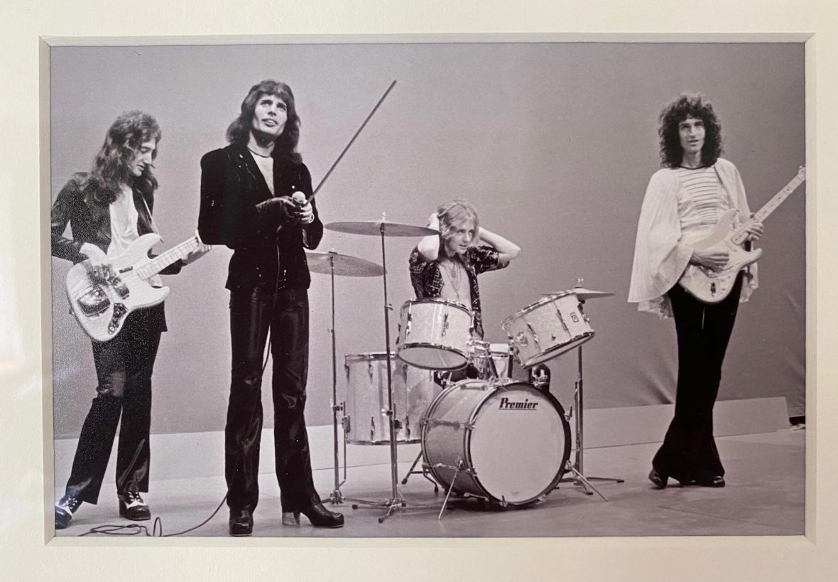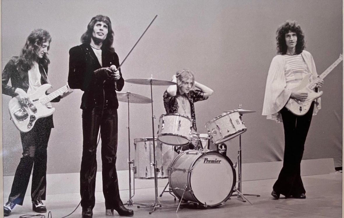 This photograph was taken following rehearsals for a performance of ‘Killer Queen’ on TopPop, a Dutch TV show on 22 November 1974. It was obviously a mimed performance as there are no leads on the guitars, and neither are there any microphones on Roger’s drum kit. Only Freddie’s microphone had a lead (for the sake of stagecraft no doubt). It must’ve been a hastily arranged TV slot too and it is particularly striking that none of the band were playing their regular instruments.