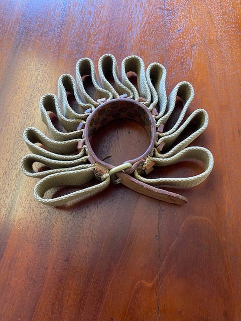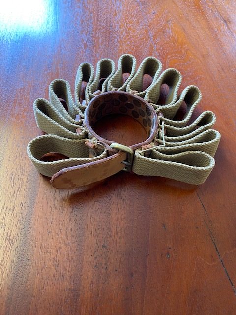 Consisting of 12 canvas loops secured to leather belt with additional leather trim and riveted with copper rivets.