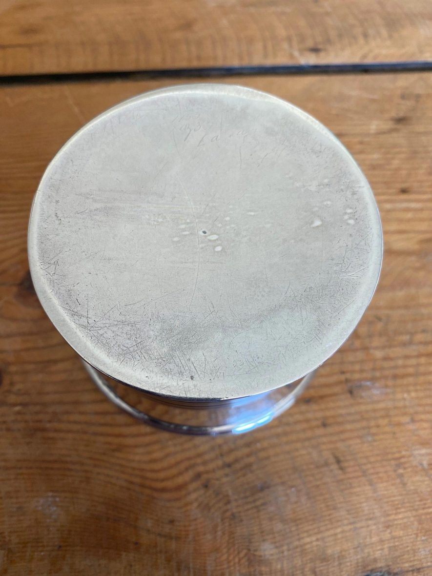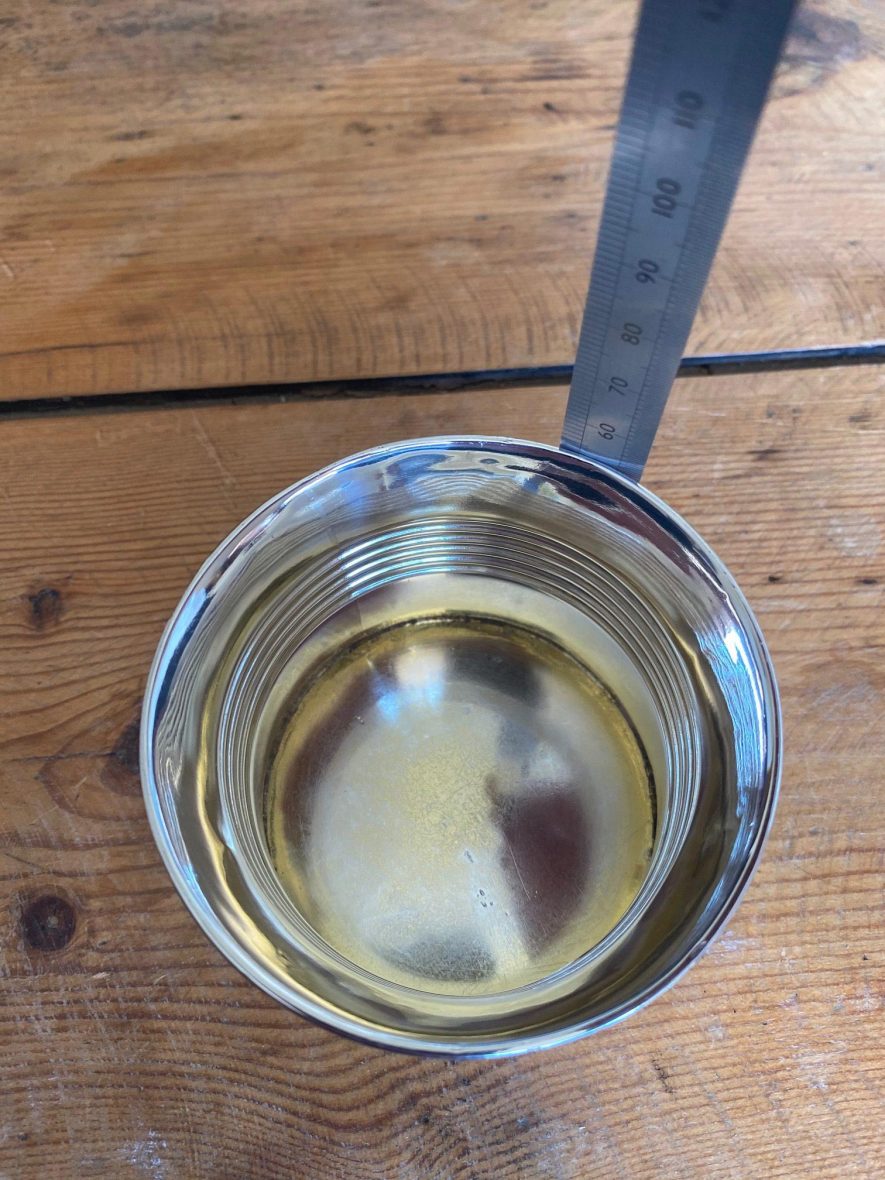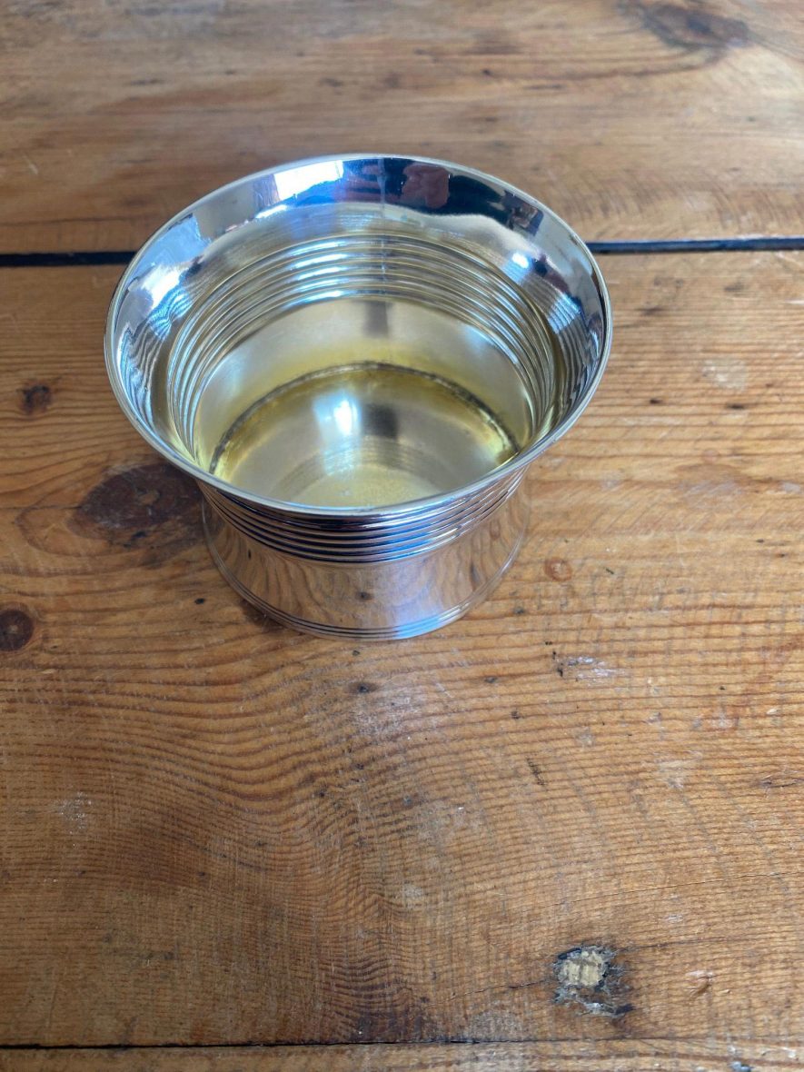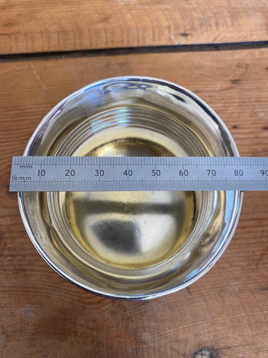 The interior gilt lining is virtually worn away. This piece has had a lot of use and has signs of wear and tear, with nicks and small dents but it is fully intact.